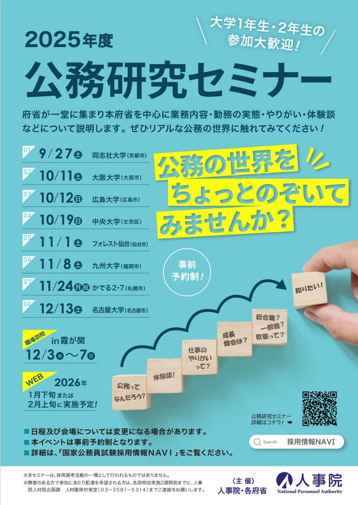 各府省の職員が各部屋で、本府省の業務概要、直面する政策課題(取組み、今後の展望等)、仕事の魅力ややりがいなどを説明します。(このセミナーは、採用・選考活動とは一切関係ありません。)