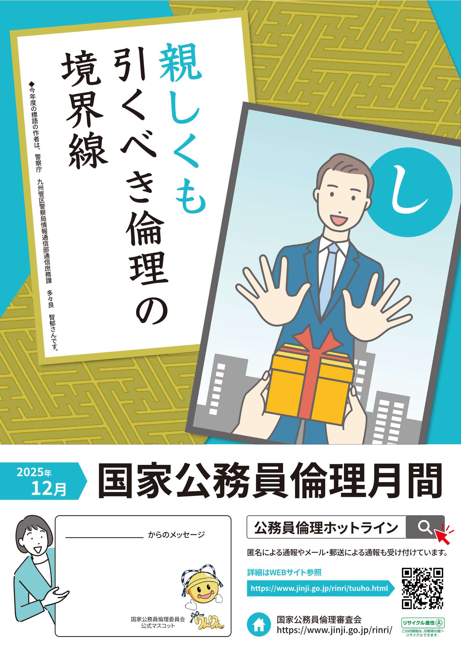 国家公務員の倫理意識の効果的な浸透を図るため、12月の1か月間を「国家公務員倫理月間」と位置付け、様々な啓発活動を集中的に行います。