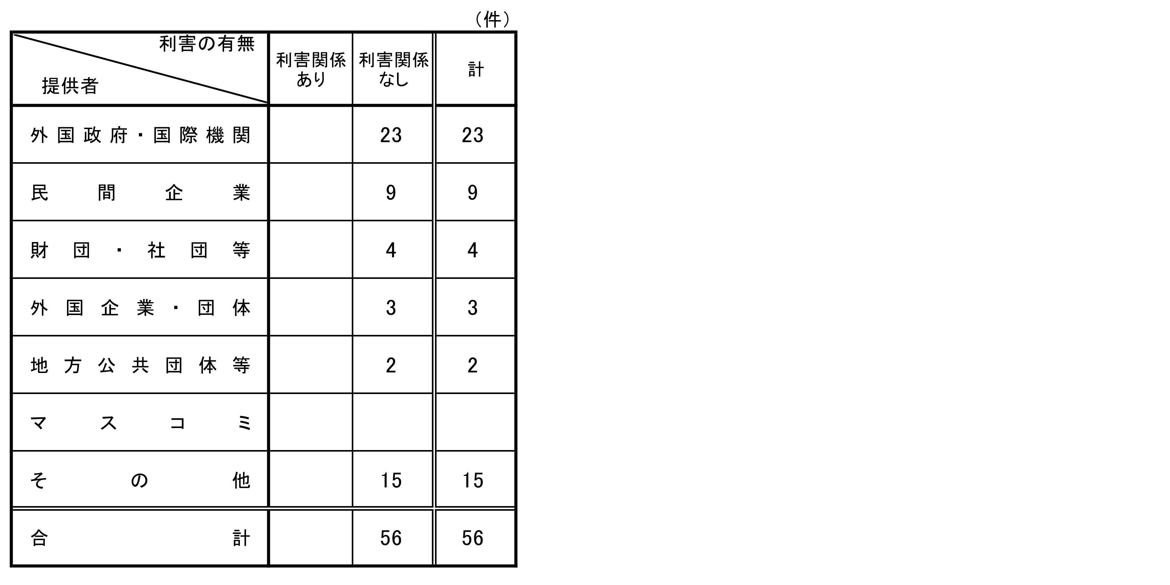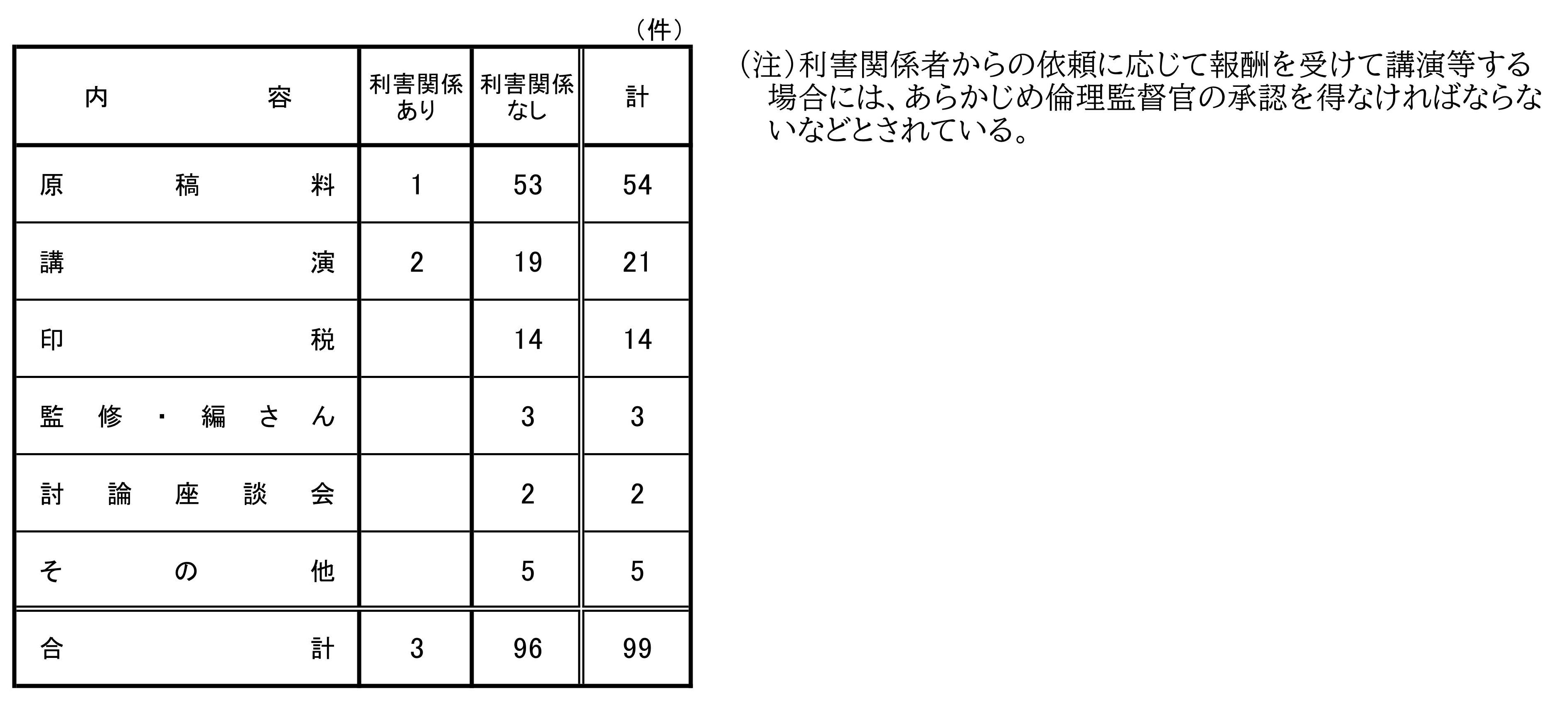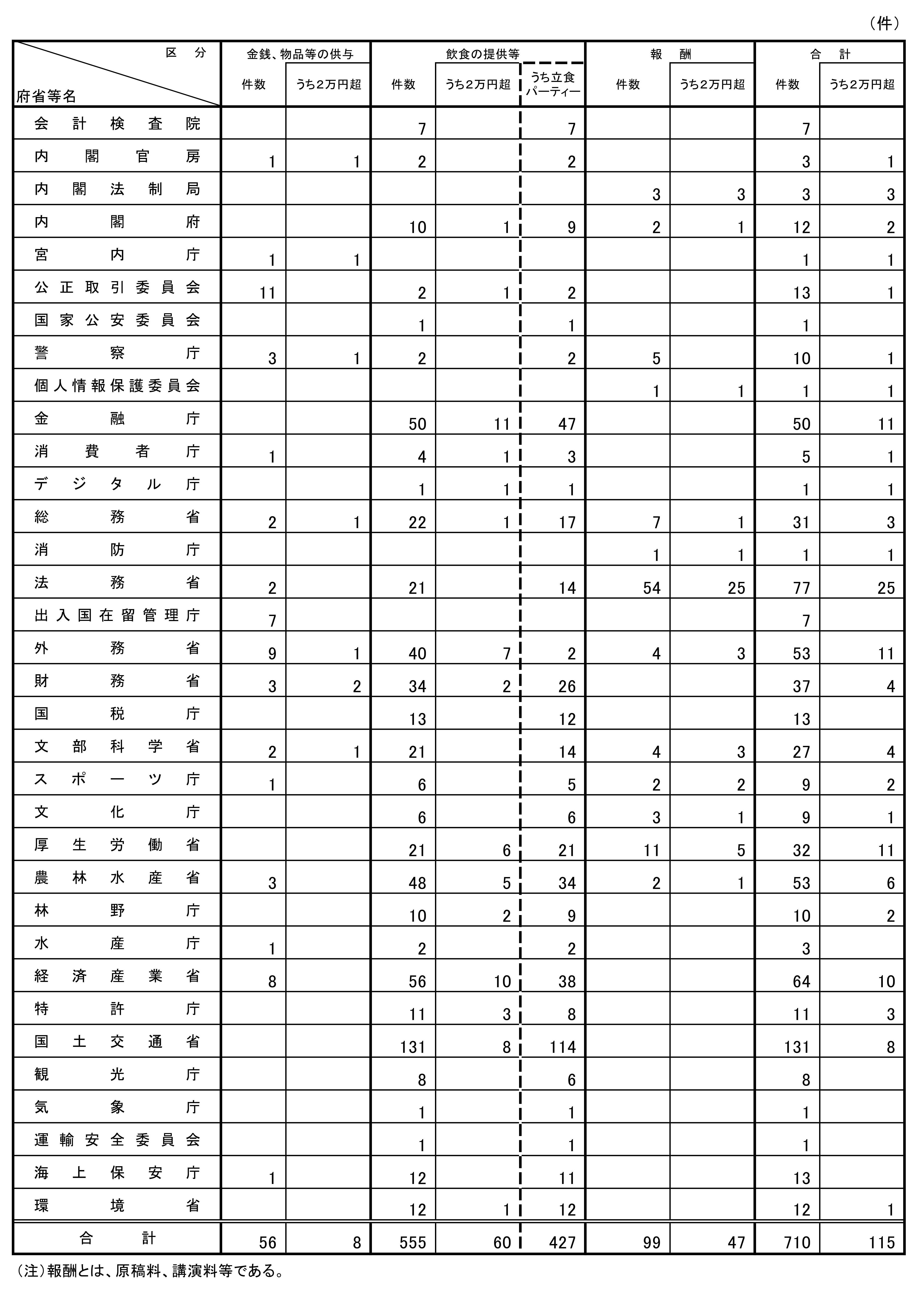 前年同期(令和6年度第2四半期)における提出件数と比較すると、今期は、金銭、物品等の供与が6件、飲食の提供等が36件の増加、報酬が17件の減少となっている。