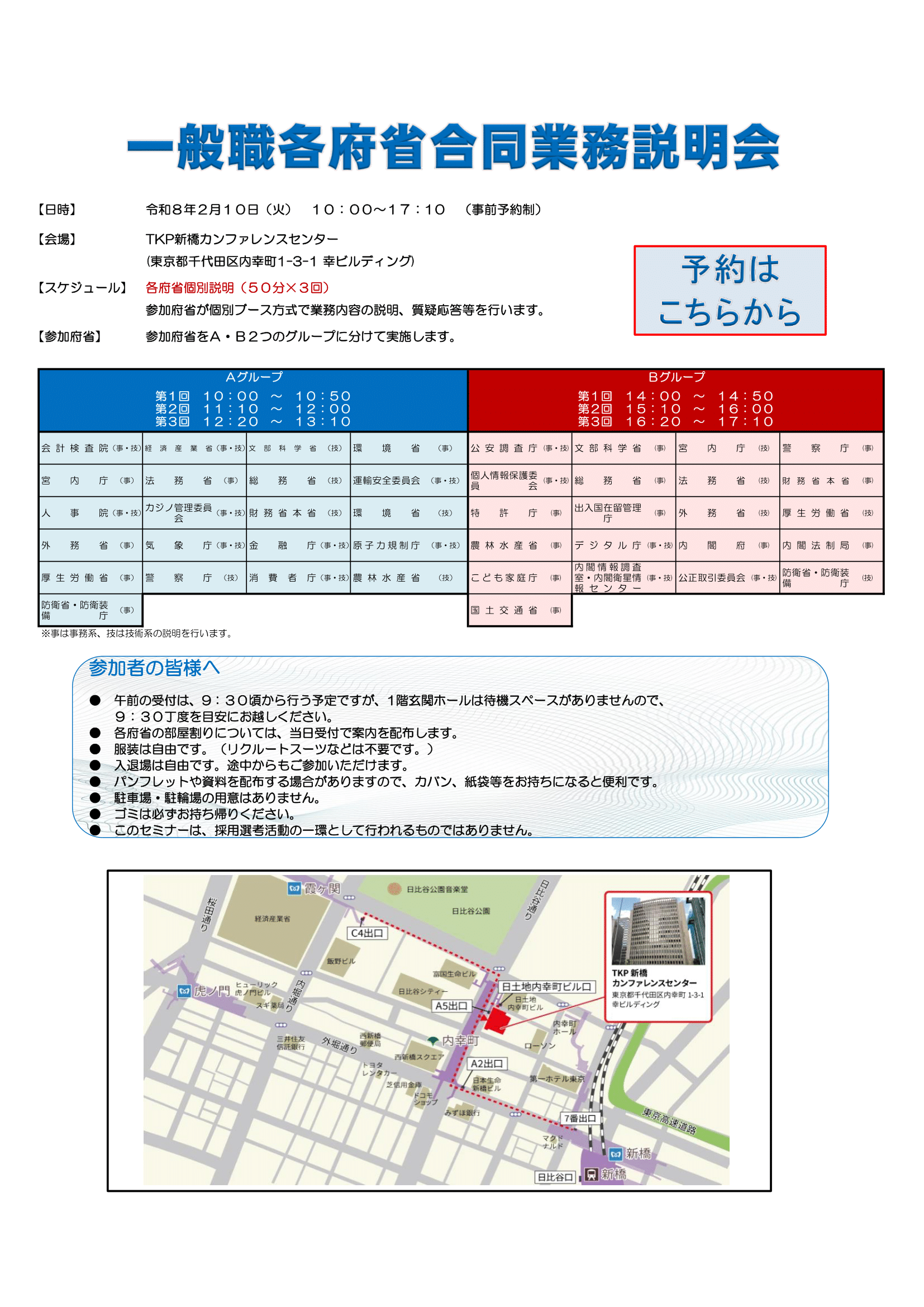 | 【参加方法】 ・本説明会は予約が必要です。 ・参加府省を午前、午後それぞれ各3回ずつの時間帯に分けて実施しますので、説明をお聞きになりたい府省の説明する区分(午前or午後)を確認してください。 ・説明時にパンフレット等を配布することがありますので、カバン、紙袋等をお持ちになると便利です。 【予約について】 ・登録されたメールアドレス宛に予約完了メールを「saiyou.npa@jinji.go.jp(採用情報メールマガジン)」より送信しますので、内容を必ず確認し、当日受付の際にメール画面又はメールを印刷したものを提示してください。 ・迷惑メールの受信拒否設定を行っている方は、【@jinji.go.jp】からのメールを受信できるよう、予め設定しておいてください。 |