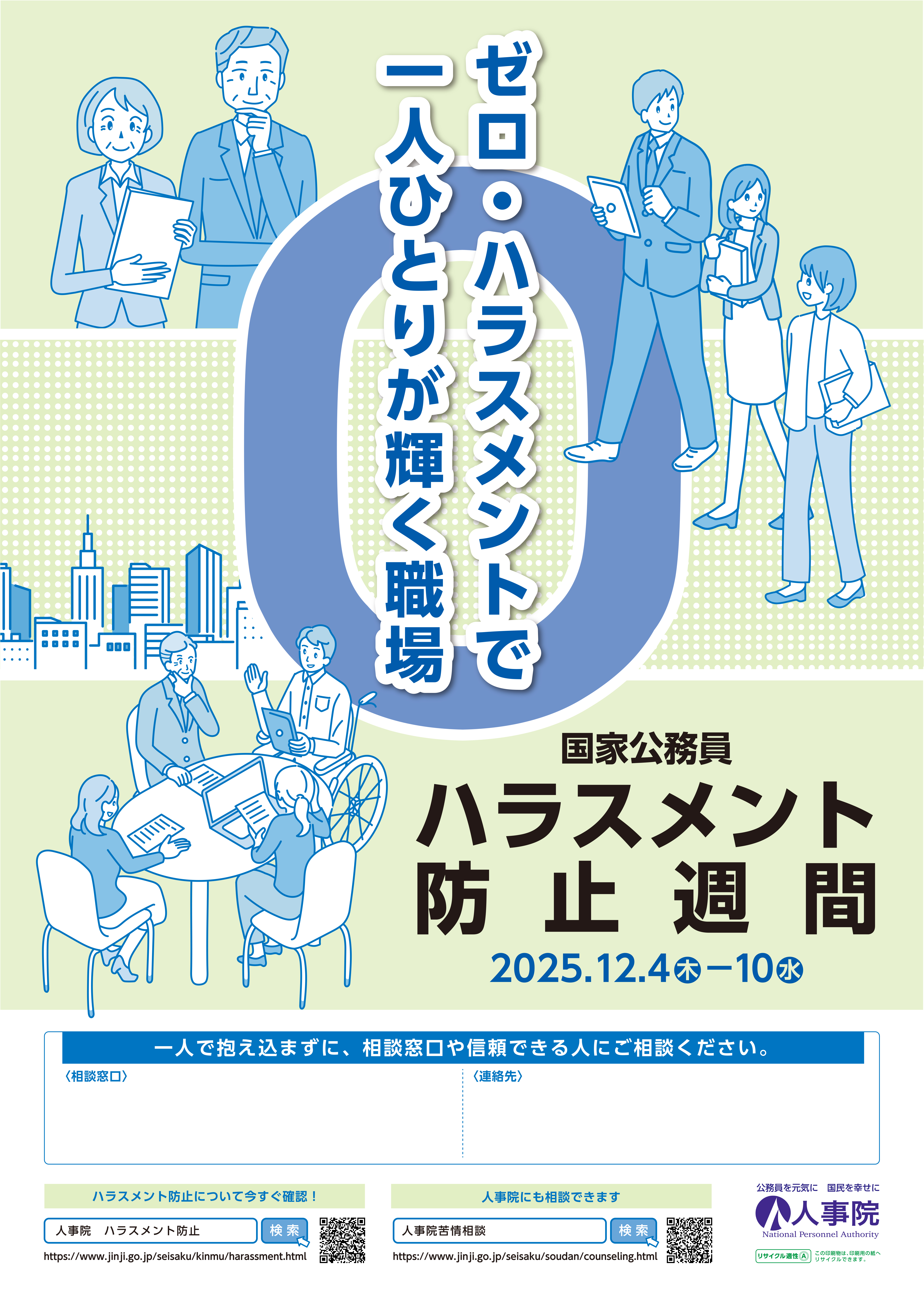 ハラスメント防止対策を、より一層組織的、効果的に進めるため、毎年、12月4日~10日までを「国家公務員ハラスメント防止週間」と定め、防止対策を推進しています。