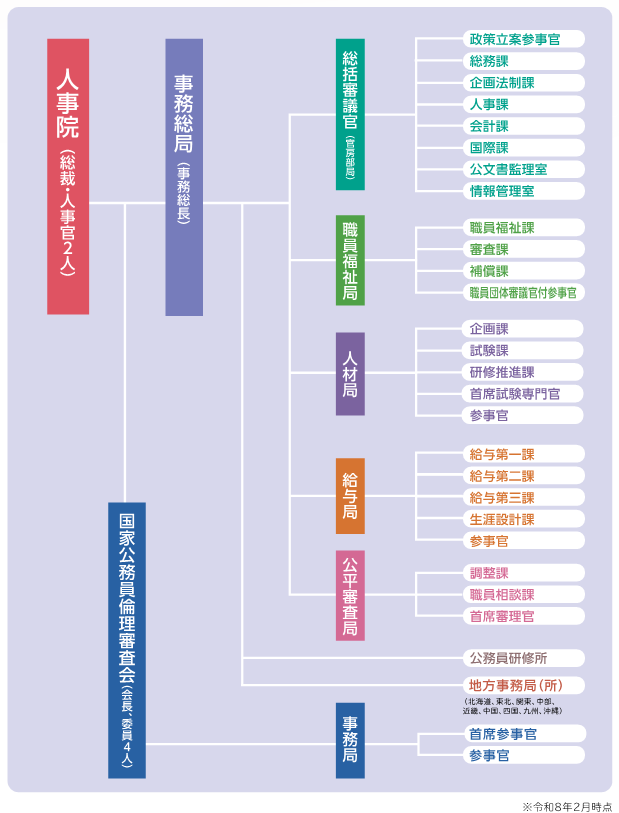 人事院にはその事務部門として事務総局が置かれ、事務総長の下に内部部局としての5課・2室(官房部局)及び4局のほか、公務員研修所、9地方事務局(所)から構成されています。