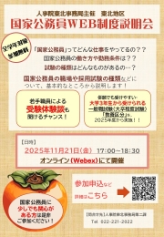 採用試験のことや働いて感じていることなど、皆さんからの疑問や質問に人事院東北事務局の職員がお答えするイベントです。 ※詳細は後日掲載します。 |