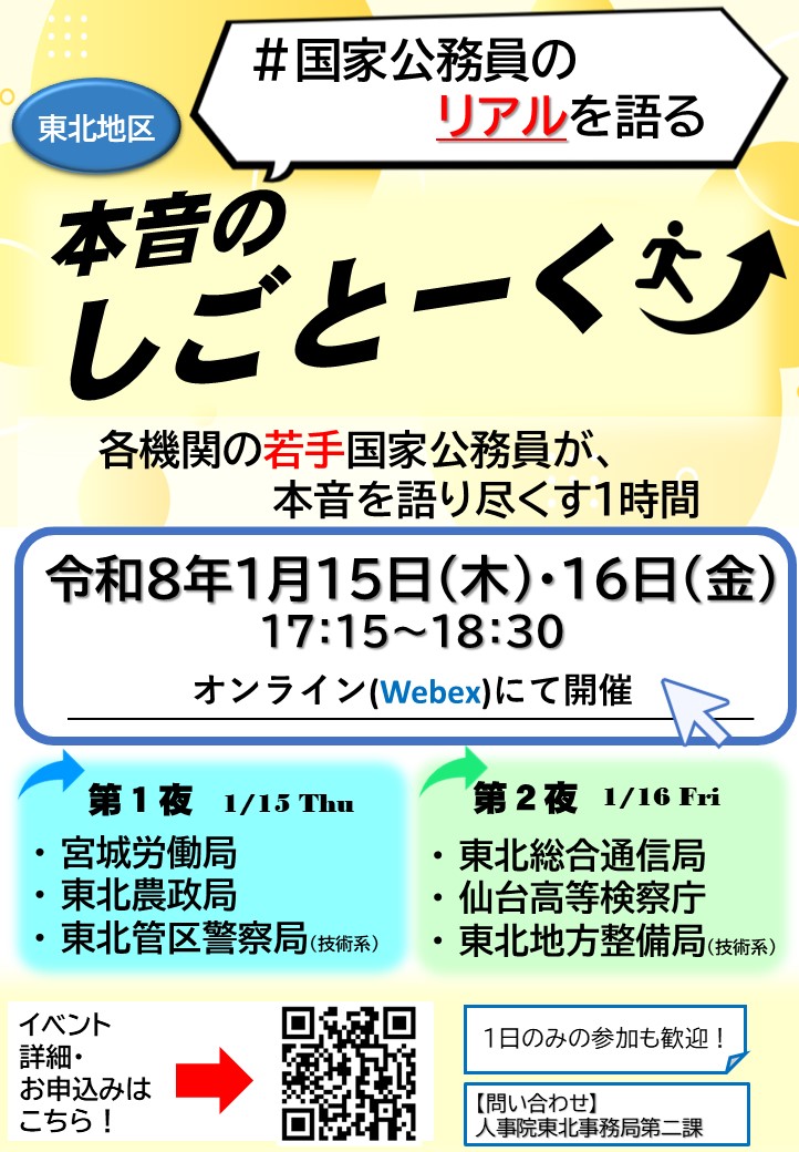 東北管内の様々な国の機関で活躍している採用数年目の若手職員によるトークセッションを開催します。