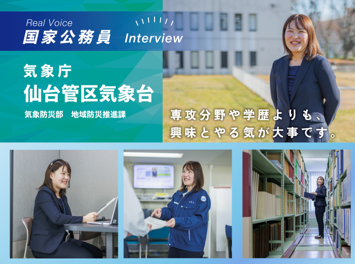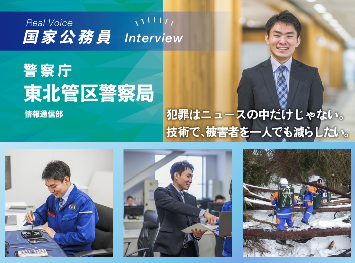 東北ではたらく国家公務員の「技術系職員インタビュー記事」を作成しました。 「国家公務員志望の理由」、「技術系職員ならではの面白さ」や「描いている未来」などについて熱く語っています! 掲載機関は東北管区警察局、 東北農政局、 仙台管区気象台です。 画像をクリック(タップ)するとインタビュー記事を閲覧できます。
